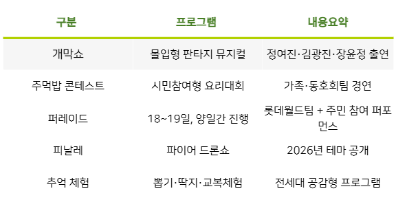 7080 추억 거리, 주먹밥 콘테스트, 퍼레이드, 드론쇼 등 세대별 참여형 프로그램이 다채롭게 구성됩니다.