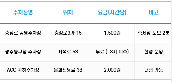 주변 지하주차장(충장로 공영, 광주동구청, ACC) 이용 권장
