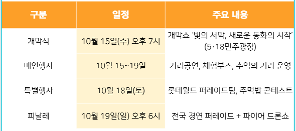 ●금남로 메인무대: 개막식, 드론쇼, 콘서트 등 대규모 공연