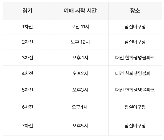 예매는 경기별로 시간대가 다르며, 아래 표처럼 순차적으로 오픈됩니다.