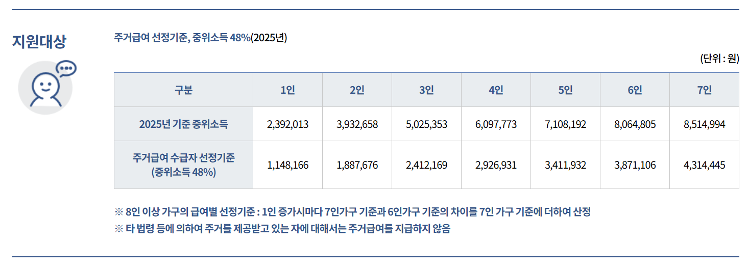 2025년 기준, 주거급여는 중위소득 47% 이하 가구가 기본 대상입니다.