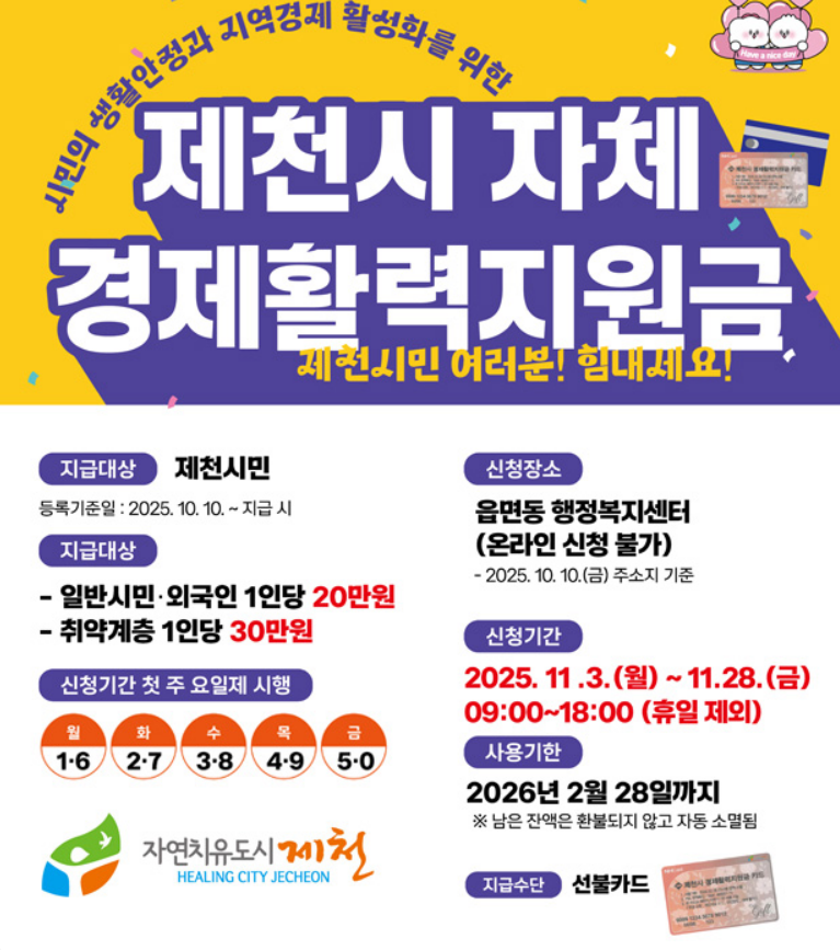 지원 대상은 2025년 10월 10일 기준 제천시에 주민등록 또는 체류지가 있는 모든 시민이다.