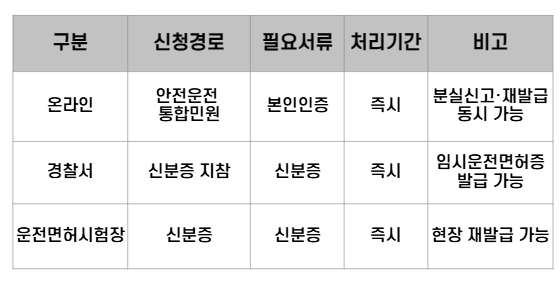 운전면허증 분실 시 온라인·경찰서·시험장에서 분실신고 및 재발급 가능.