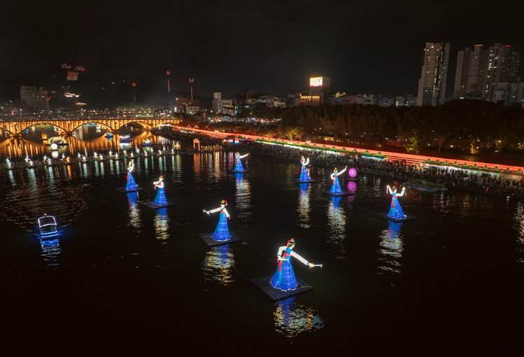 밤하늘 아래 남강에 비친 수많은 등불은 마치 시간과 공간을 초월한 아름다움을 선사합니다.