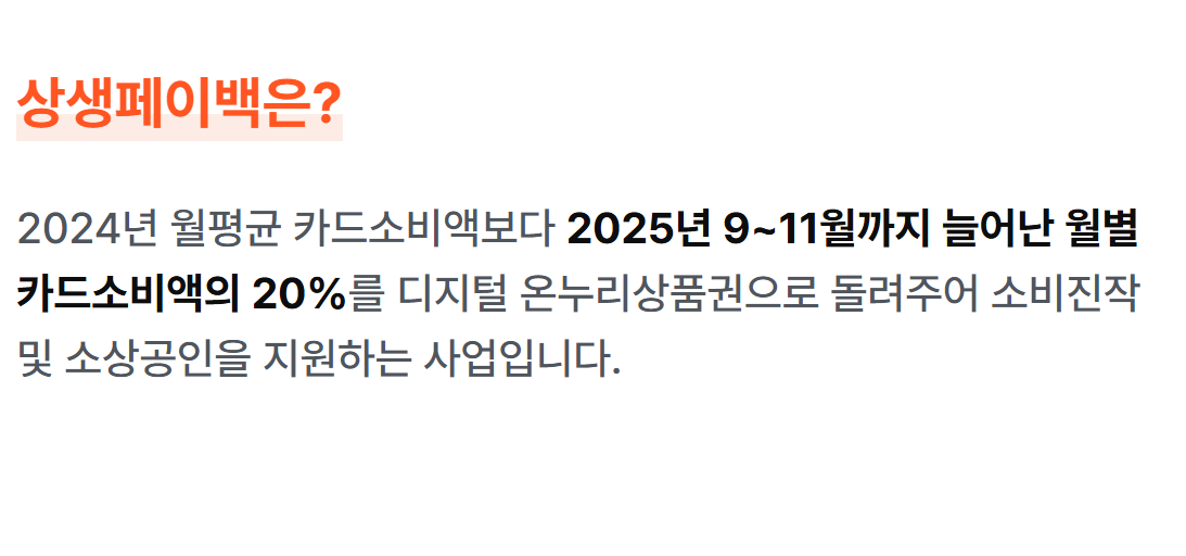 상생페이백은 2025년 9~11월 사이 카드 사용 증가분 20%를 디지털 온누리상품권으로 지급하는 소비 환급 프로그램입니다.