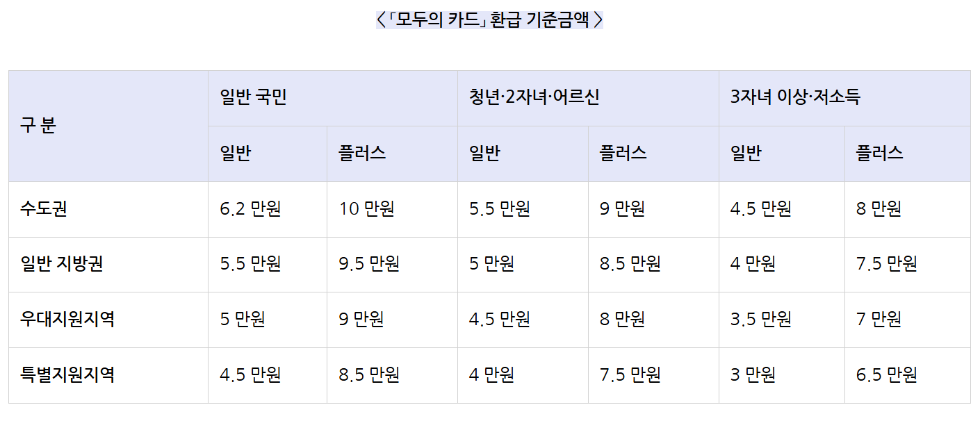 모두의 카드 환급 구조의 핵심은 지역별로 다른 환급 기준금액입니다.